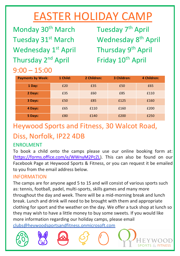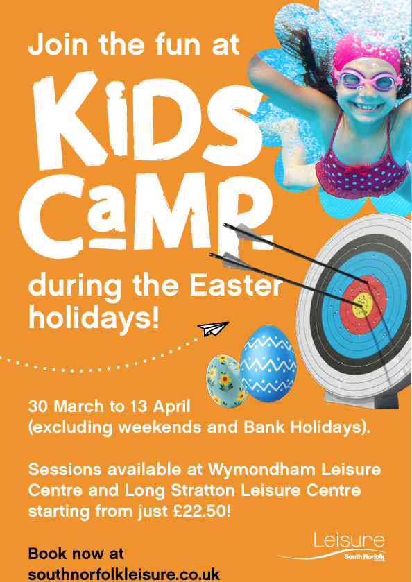 Kids Camp is open March 30 to April 13 (excluding weekends and bank holidays) from 8.30-5pm each day at Long Stratton Leisure Centre and Wymondham Leisure Centre and we have lots of exciting Easter activities planned as well as a visit from Mini Monsters and a Nerf Combat session.