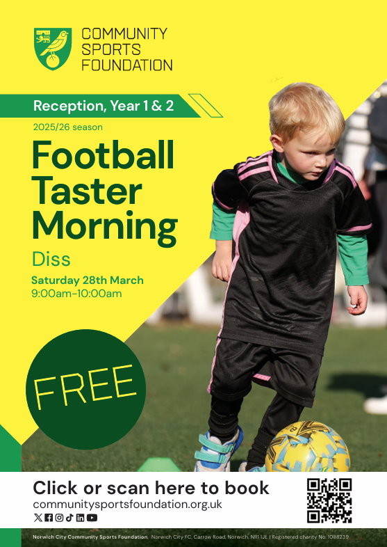 Please see attached a flyer with information of a free football taster session that Norwich City Community Sports Foundation are running. They will be hosting a reception and year one, boys and girls taster event, on Saturday 28th March at Diss Town Football Club.